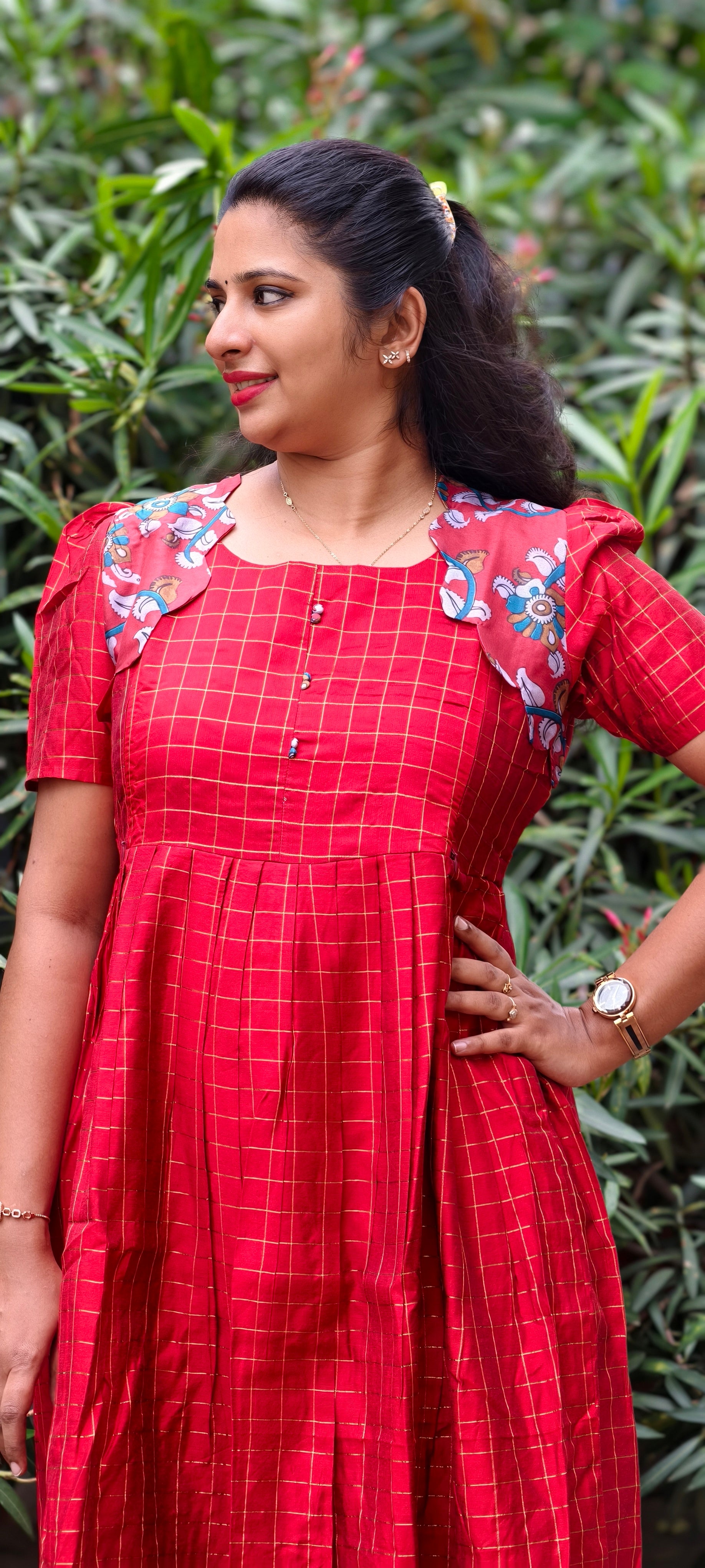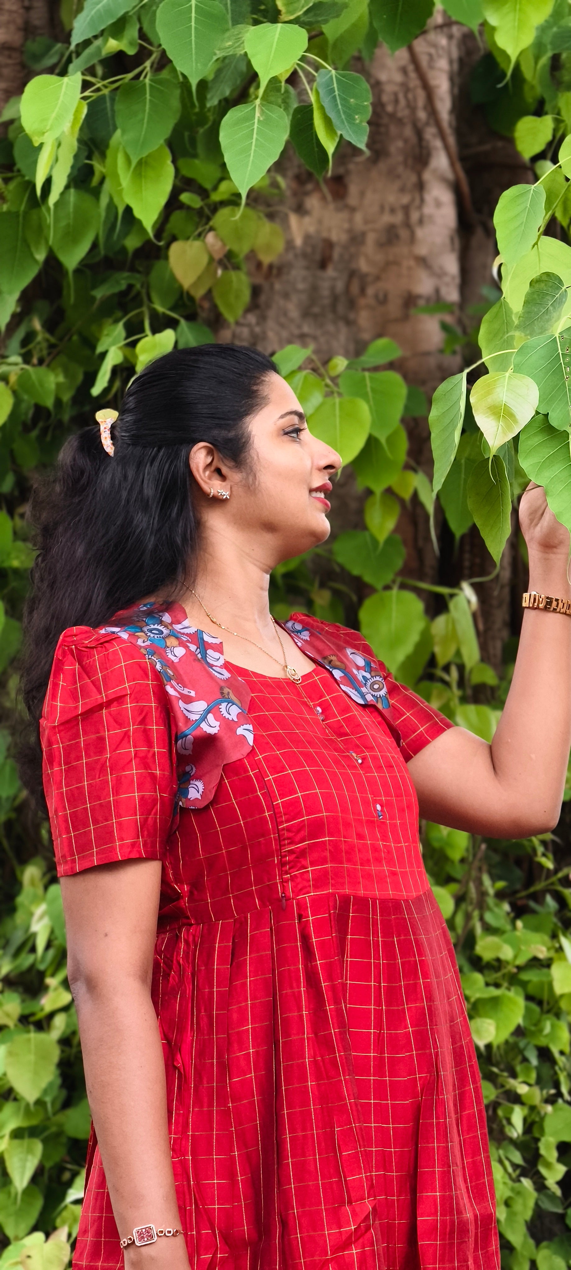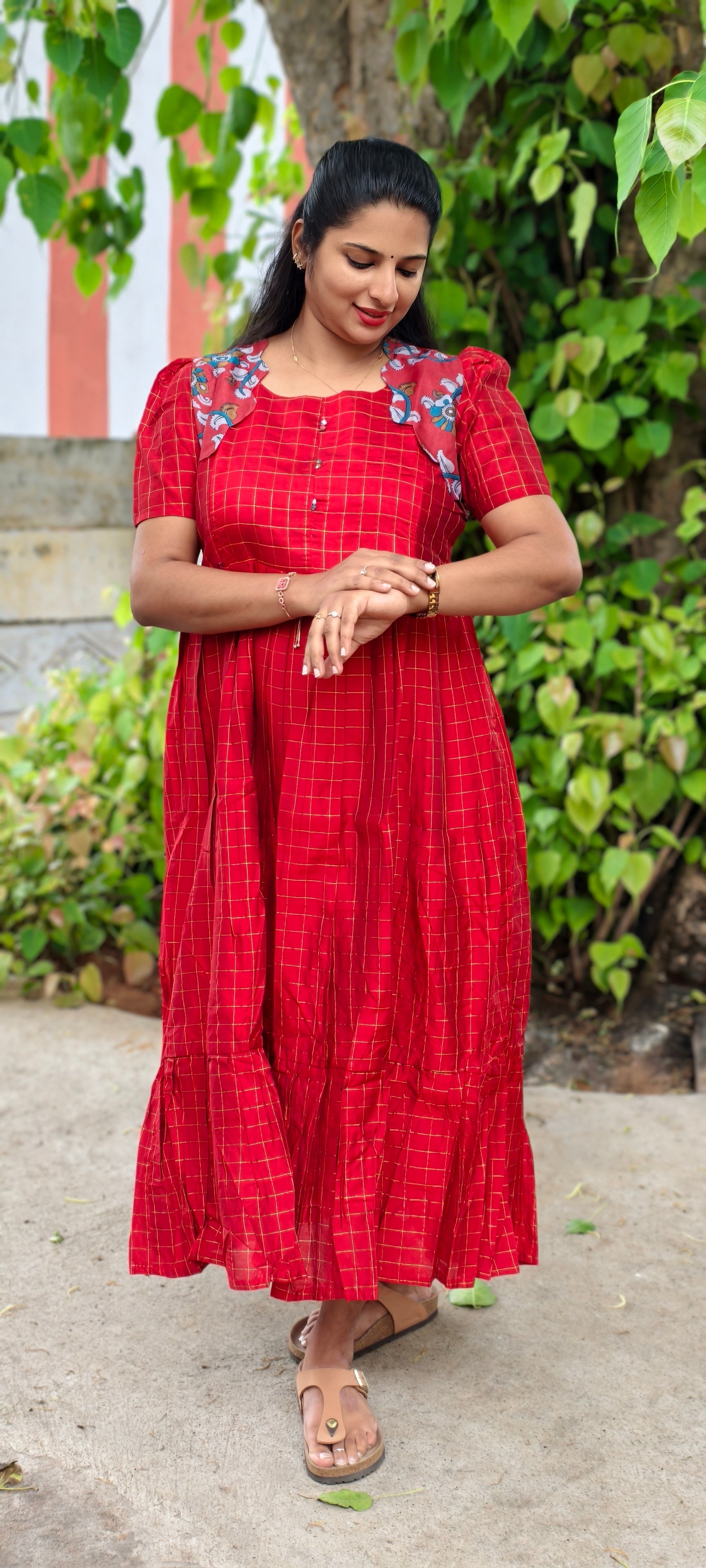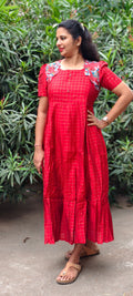 Premium Silk Cotton 2-Tier Red Festive Maxi With Scallop Silver